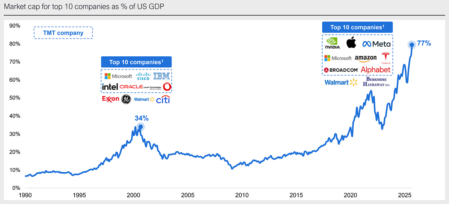 Since these remarks were made, Nvidia’s market value has risen past $5 trillion. In aggregate, AI-related stocks account for about 75% of S&P 500 returns, 80% of earnings growth and 90% of capital spending growth since ChatGPT launched in November 2022. The five largest US technology companies are now worth more than the combined markets of the Euro Stoxx 50, the UK, India, Japan and Canada; the ten largest US stocks account for nearly a quarter of global equity. It is understandable that people are asking whether we are in a bubble.