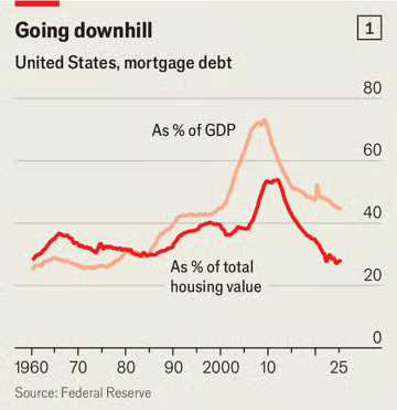 For all the talk of bubbles in equity markets, private credit and elsewhere, the market that hosted the last great bubble has been quiet. It’s still vast: At roughly $13.5 trillion, more mortgage loans are outstanding than corporate bonds in the US. But its footprint has been shrinking. As The Economist notes this week, mortgage balances have fallen by almost 30 percentage points relative to the size of the economy since the peak of the last boom, taking them back to late-1990s levels. Set against the value of American homes, the decline looks even starker: mortgage debt now amounts to barely a quarter of household real-estate wealth, the lowest share in more than six decades.