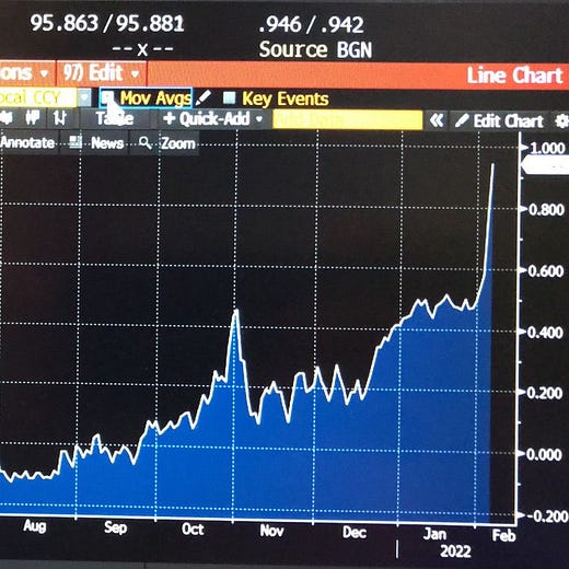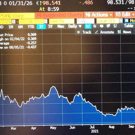 European rates are moving up quickly. Two months ago, the German 10-year yield was negative 40 basis points; it is now positive 28 basis points. Economists anticipate that the European Central Bank will lift the benchmark deposit rate back up to zero by the end of the year; they expect a further 50 basis point per year hiking pace over 2023 and 2024.